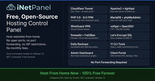 arrow-up13arrow-down1image[Promoting] Host Your Own Websites from Home — Free Control Panel for Debian 12 — iNetPanelplus-squarelemmy.mlTuxxin2@lemmy.mlEnglish · edit-24 days agomessage-square2linkfedilink