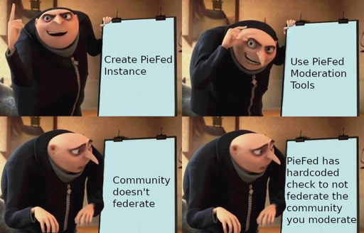 One point: I would argue that opt-in vs. -out doesn’t fully apply here, as this automated convenience function will only ever be run once upon initial setup for an instance, after which the instance admin can add any communities they desire, manually (I’m not sure why OP phrased it then as needing to be “debugged”, that seems an odd term for such routine instance maintenance tasks that do not need any modification of any code at all, anywhere?). In short, it’s not actually a “block” at all, as the wording in the meme seems to me to strongly imply by using “federate”). The phrase “opt-out” usually referrs to something harsh but that isn’t all the way fully forced, but this issue of not pulling in (initially) of communities is so extremely gentle than on the spectrum it is adjacent to “opt-in” already? Still, ultimately you are probably correct, I am just not sure of the wording there, so wanted to help by offering those additional nuances.