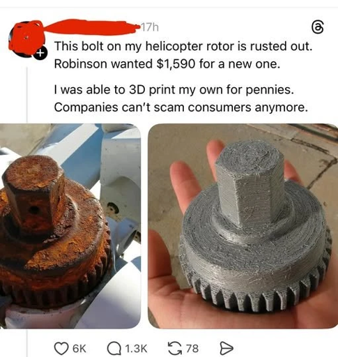 Absolutes always get me scheming. What if you’re stuck on a deserted island with only a working 3d printer and a helicopter missing this part? What then? Yeah probably swim.