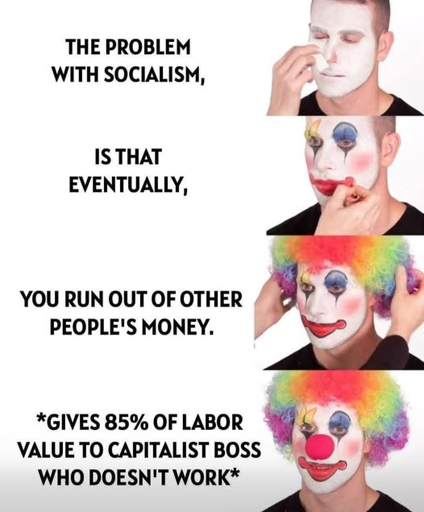 In relation to the last panel, they are saying that they are giving 85% of their labor value to their boss who doesn’t work. There’s multiple problems with this way of thinking. The first and most obvious one is the 85%, which is just an arbitrarily large number to make it feel scary.