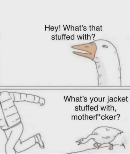 wears jacket stuffed with goose feathers