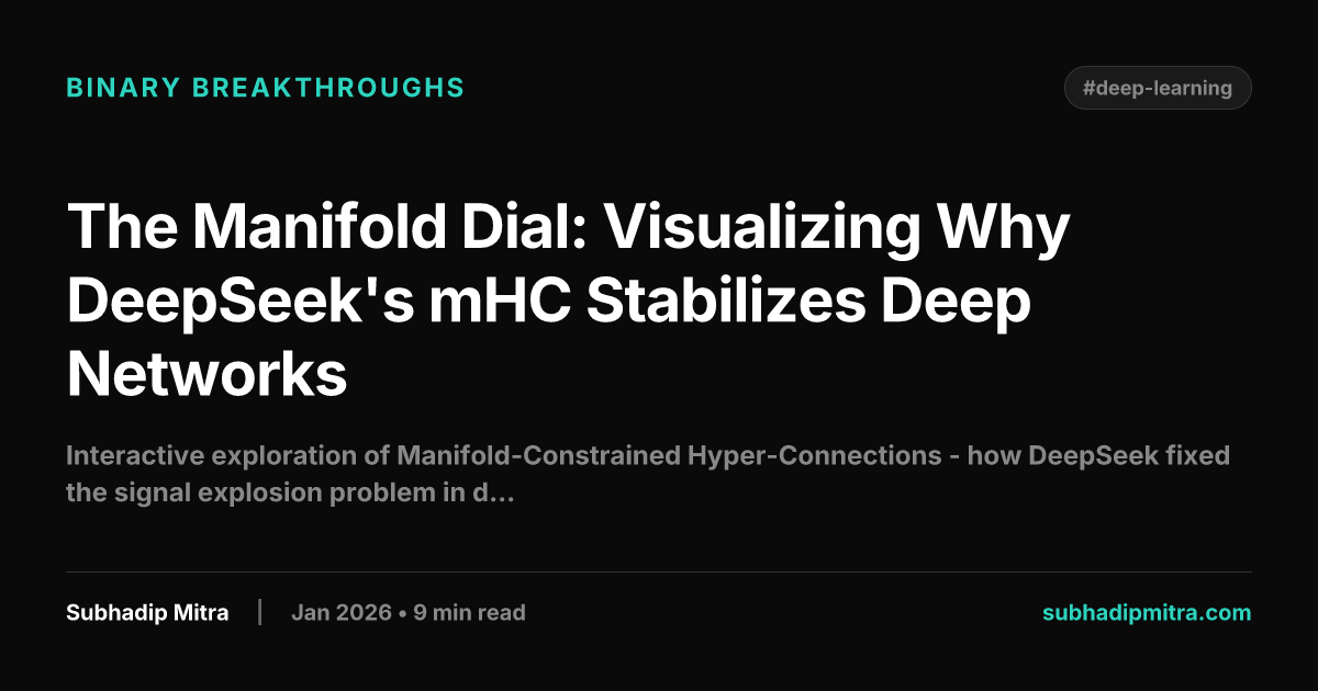 cm0002@lemdro.id to Technology@lemmy.zipEnglish · 3 months agoThe Manifold Dial: Visualizing Why DeepSeek's mHC Stabilizes Deep Networksplus-squaresubhadipmitra.comexternal-linkmessage-square0linkfedilinkarrow-up14arrow-down11